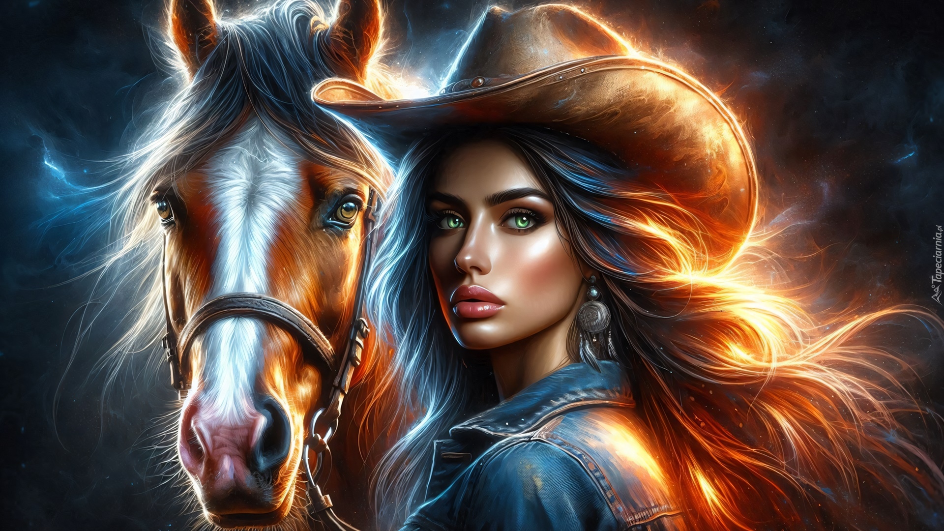 Edytor tapety: Grafika kobiety w kapeluszu z koniem