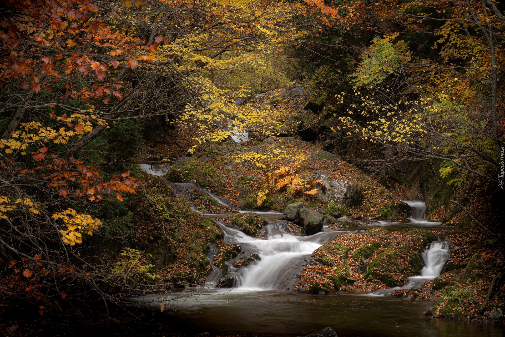 Edytor tapety: Jesienne drzewa przy potoku na skałach
