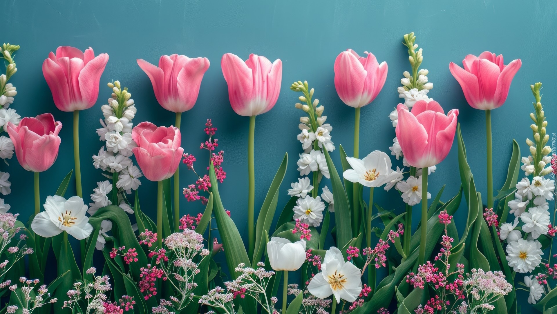 Edytor tapety: Tulipany i kolorowe kwiaty na niebieskim tle