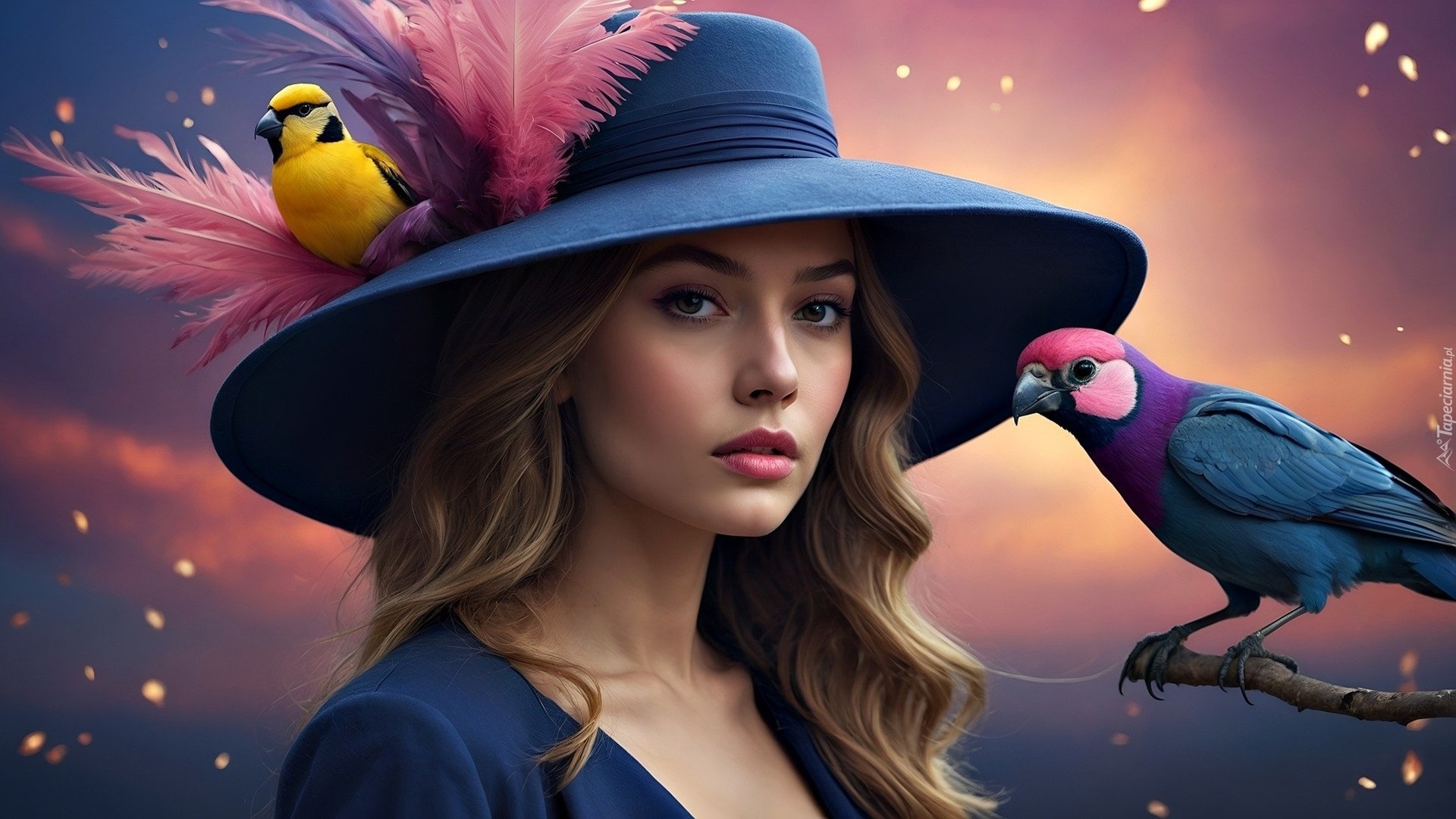 Edytor tapety: Dwa ptaki i kobieta w kapeluszu z piórami