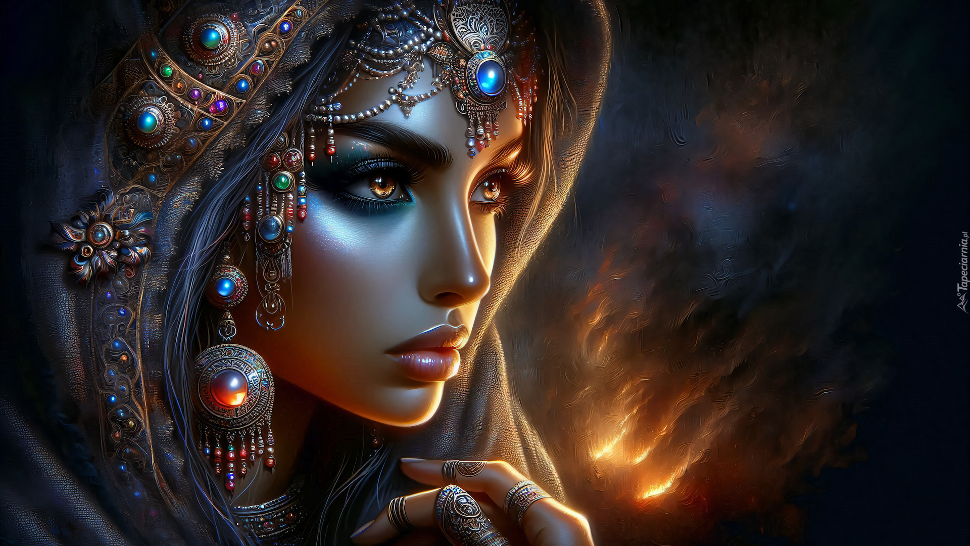Edytor tapety: Twarz kobiety w kapturze z biżuterią w grafice