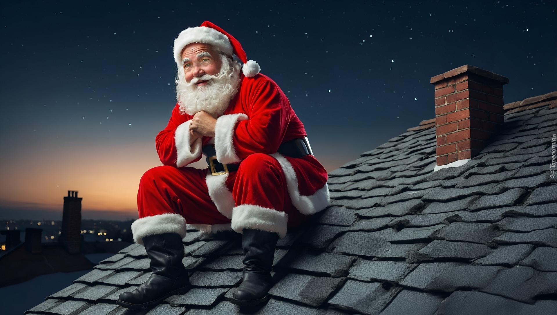 Edytor tapety: Uśmiechnięty Święty Mikołaj siedzący na dachu nocą