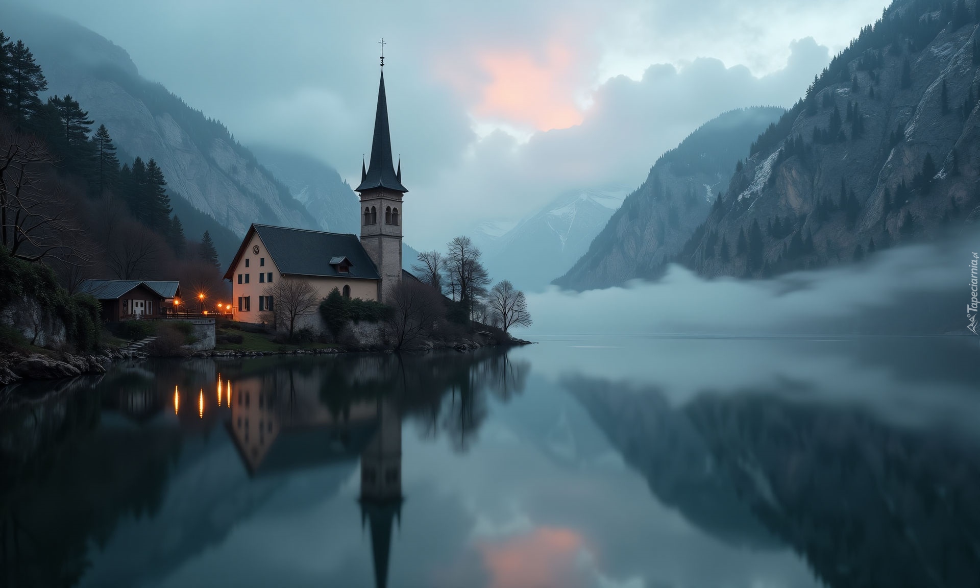 Edytor tapety: Kościół na brzegu zamglonego jeziora i gór