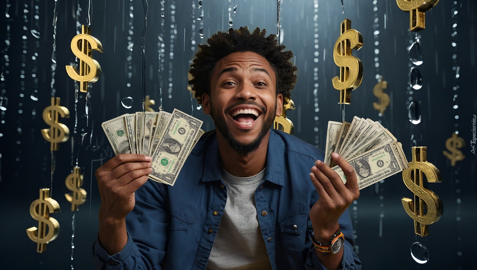 Edytor tapety: Uśmiechnięty mężczyzna z banknotami w dłoniach
