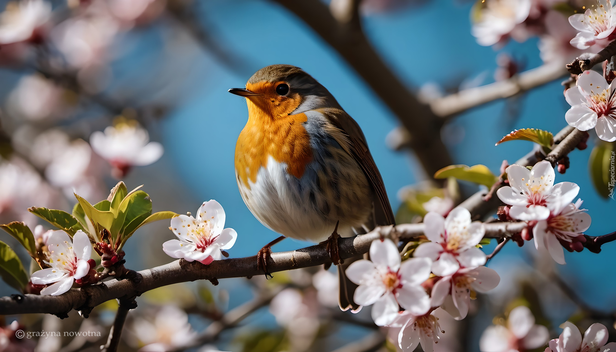 Edytor tapety: Rudzik na gałązce z białymi kwiatami