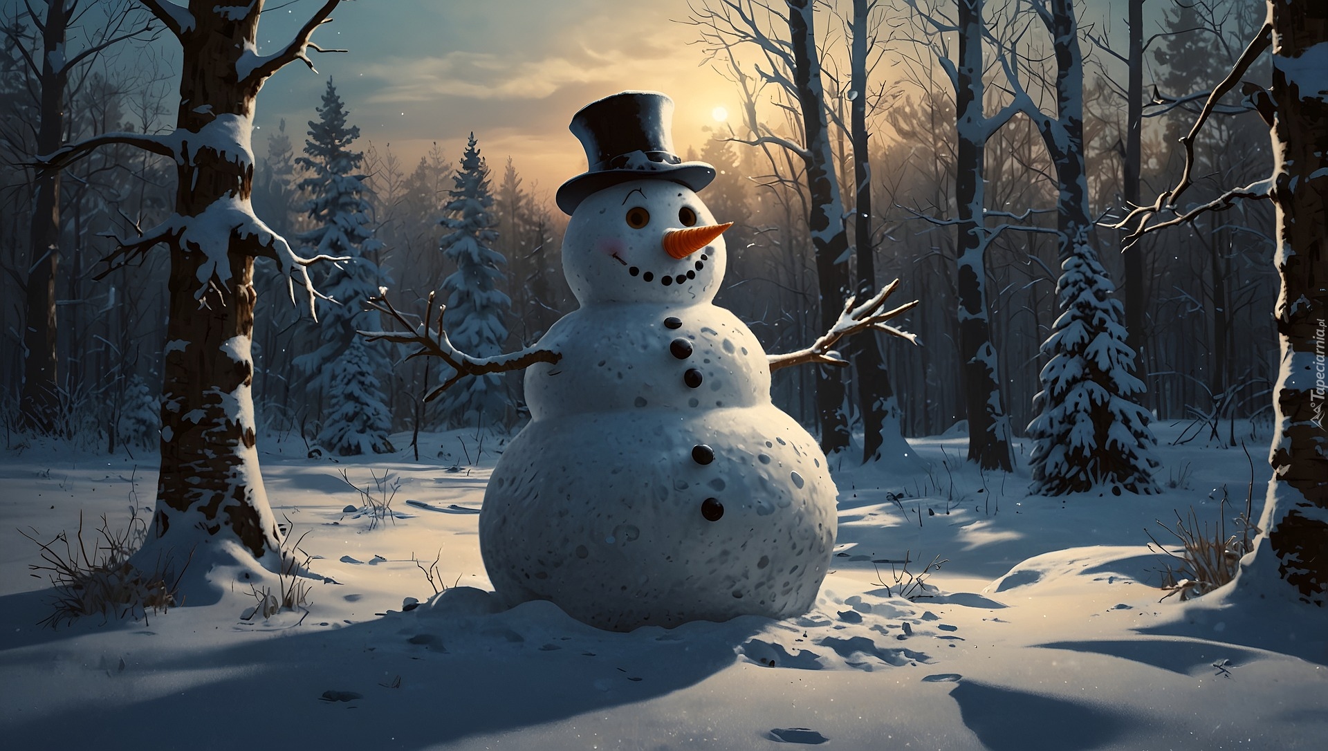 Edytor tapety: Bałwan w kapeluszu na śniegu obok drzew