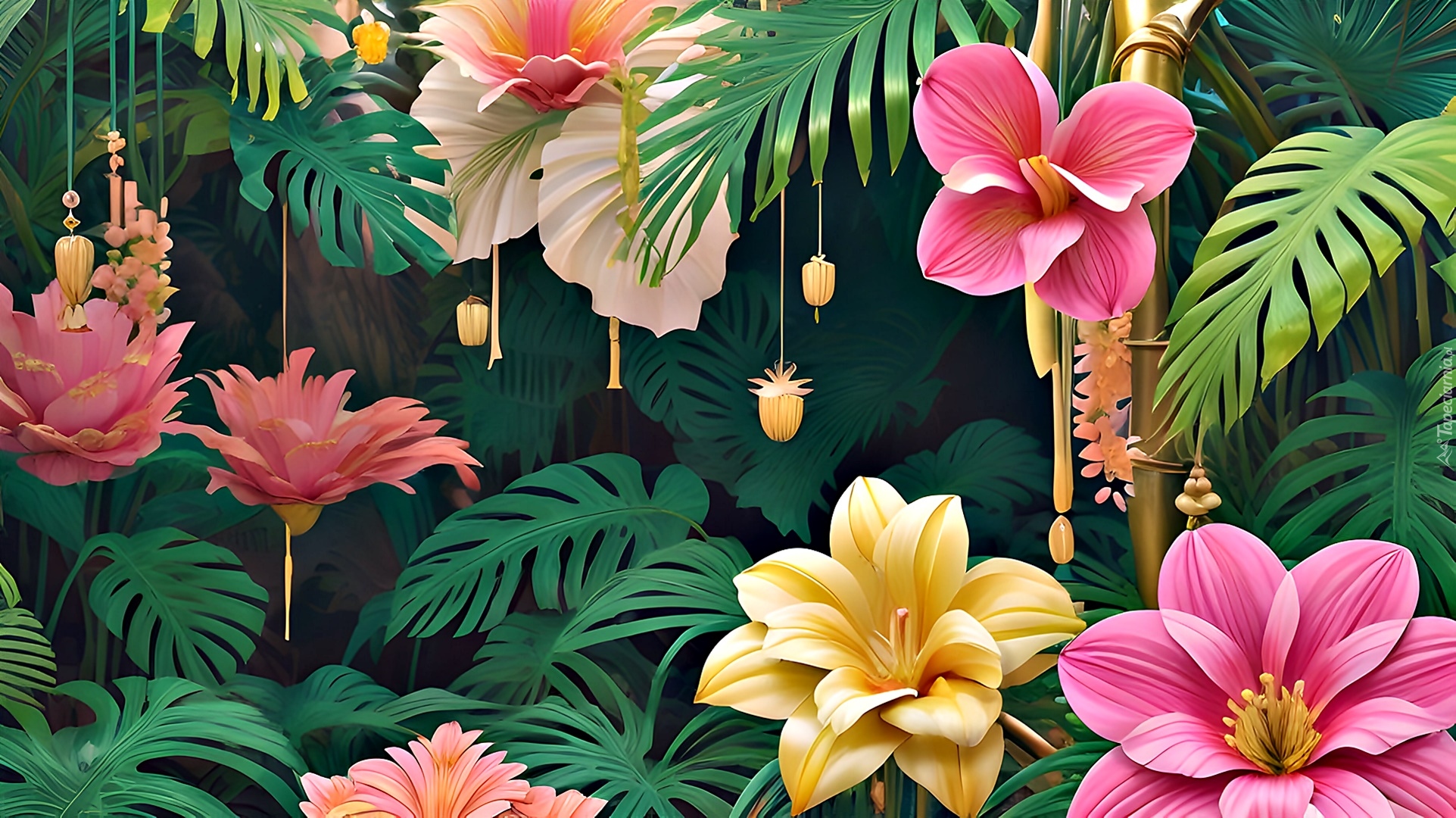 Edytor tapety: Kolorowe egzotyczne kwiaty z liśćmi w grafice