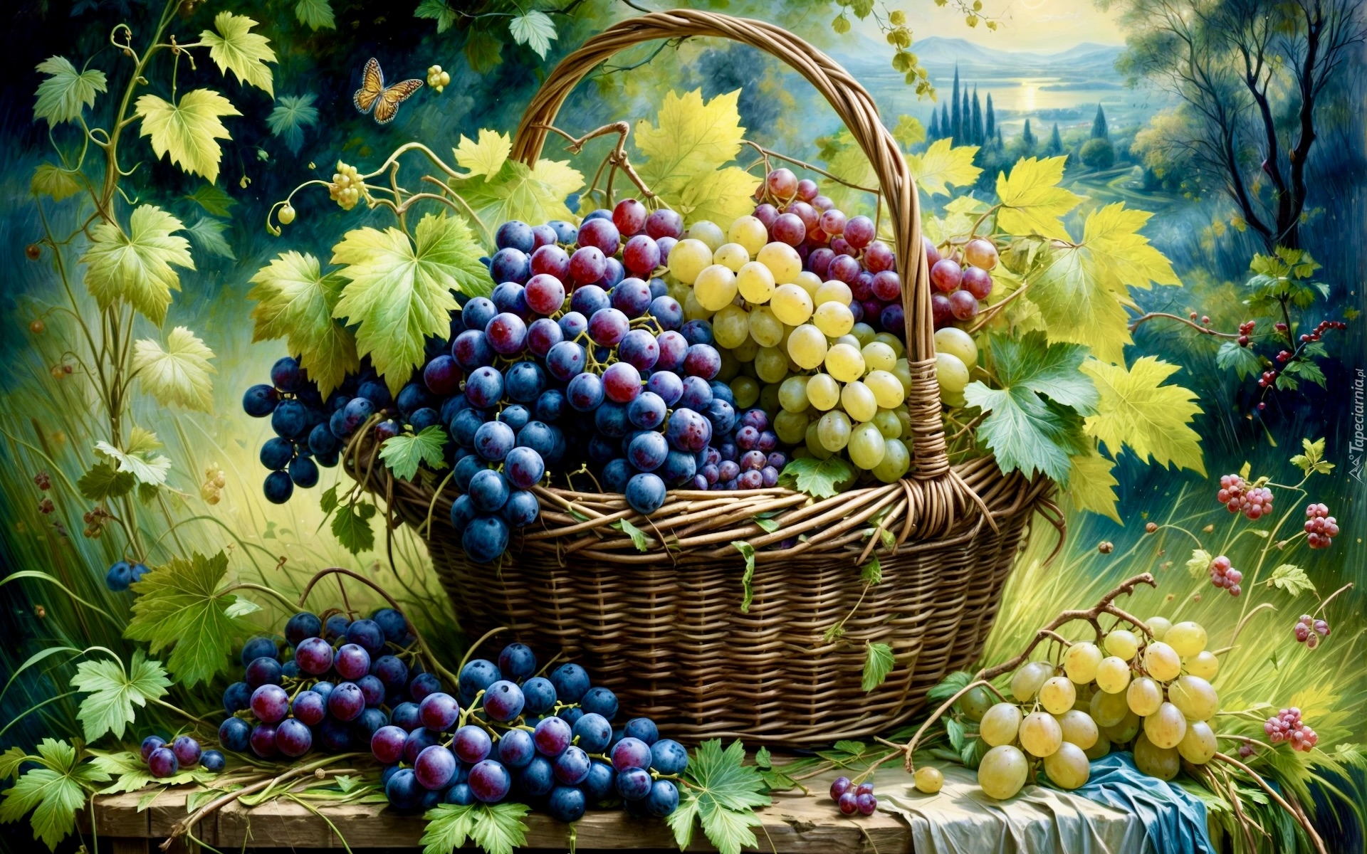 Edytor tapety: Kiście winogron w koszyku i obok w grafice