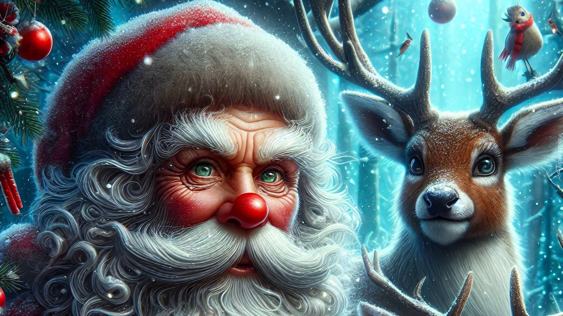 Edytor tapety: Święty Mikołaj i renifer w zimowej scenerii