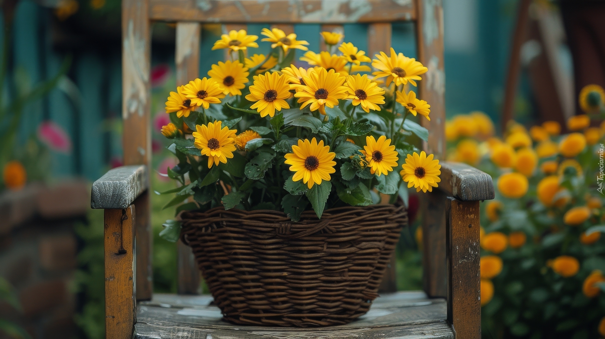 Edytor tapety: Żółte kwiaty w wiklinowym koszyku na krześle