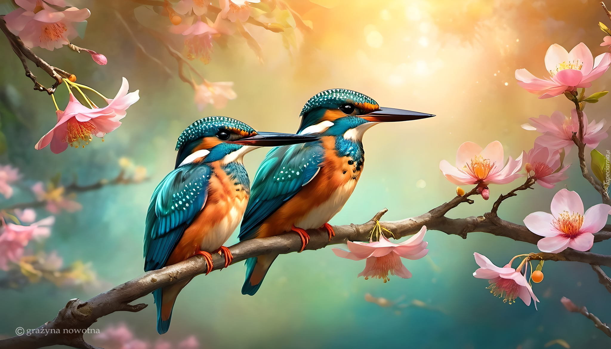 Edytor tapety: Dwa zimorodki na gałązce z różowymi kwiatami