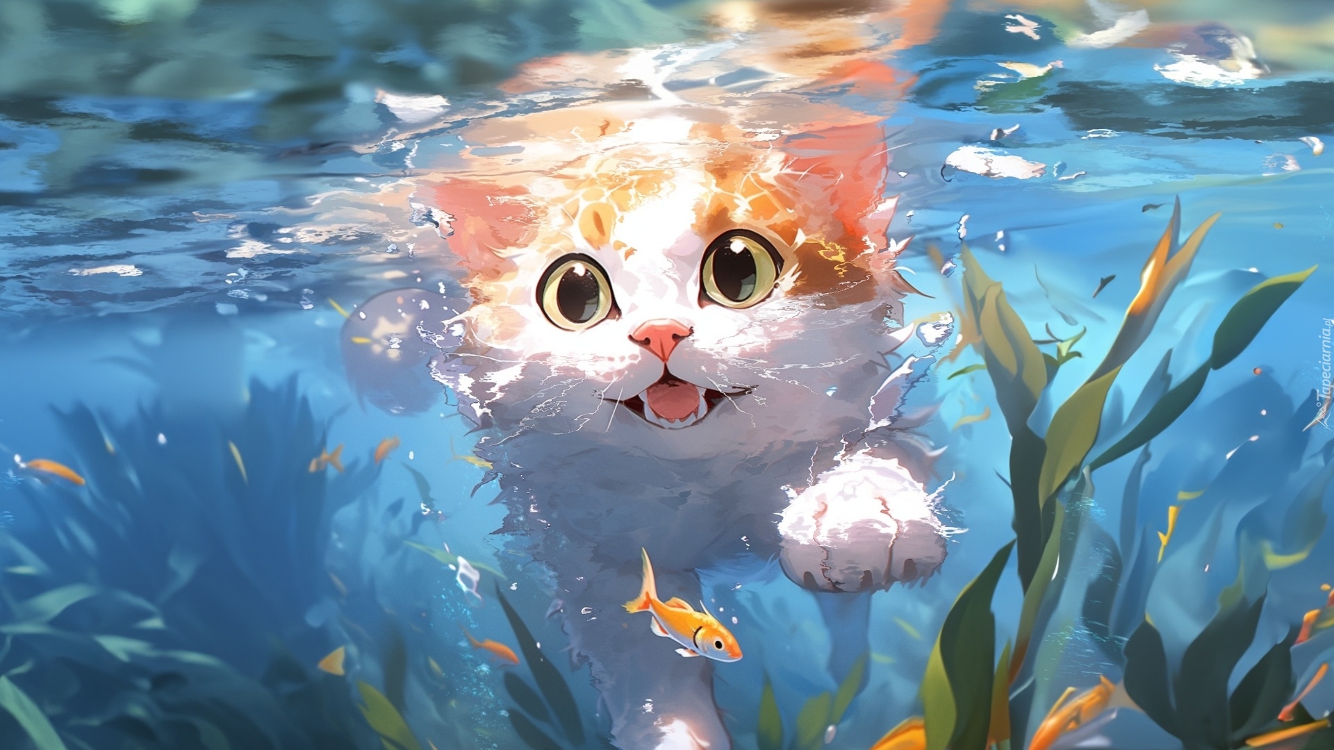 Edytor tapety: Kotek pod wodą i rybki w akwarium