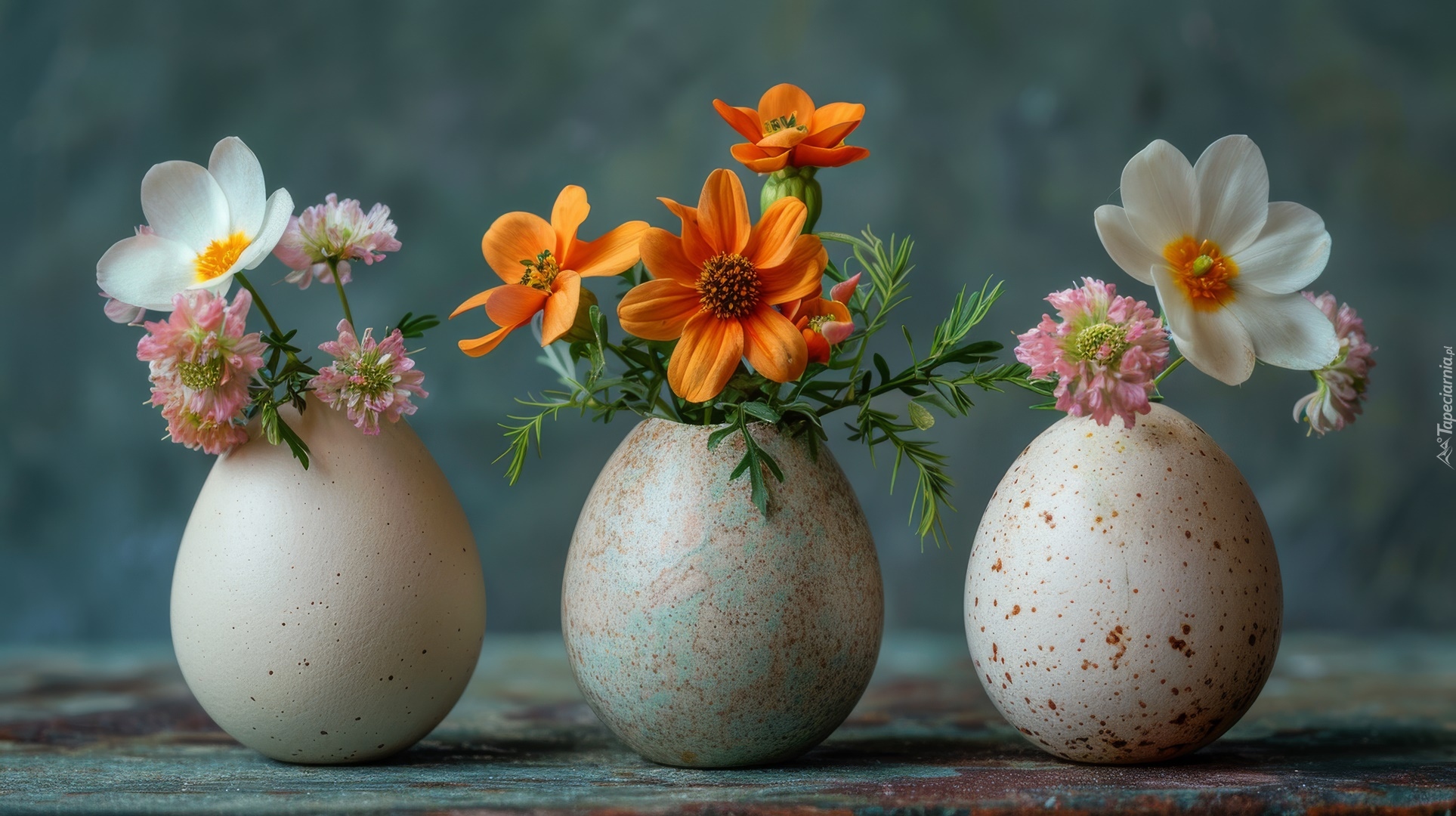 Edytor tapety: Bukiety kolorowych kwiatów w trzech wazonach w grafice