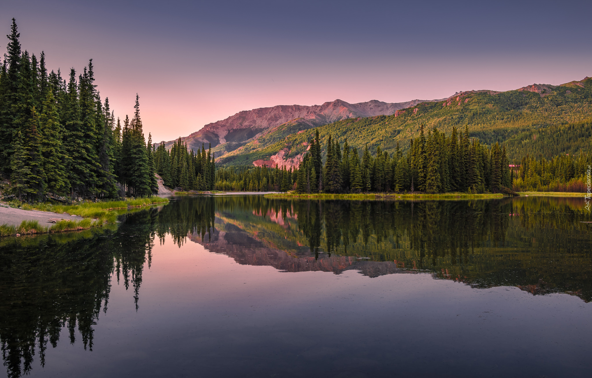 Edytor tapety: Pogodny poranek nad jeziorem na tle gór