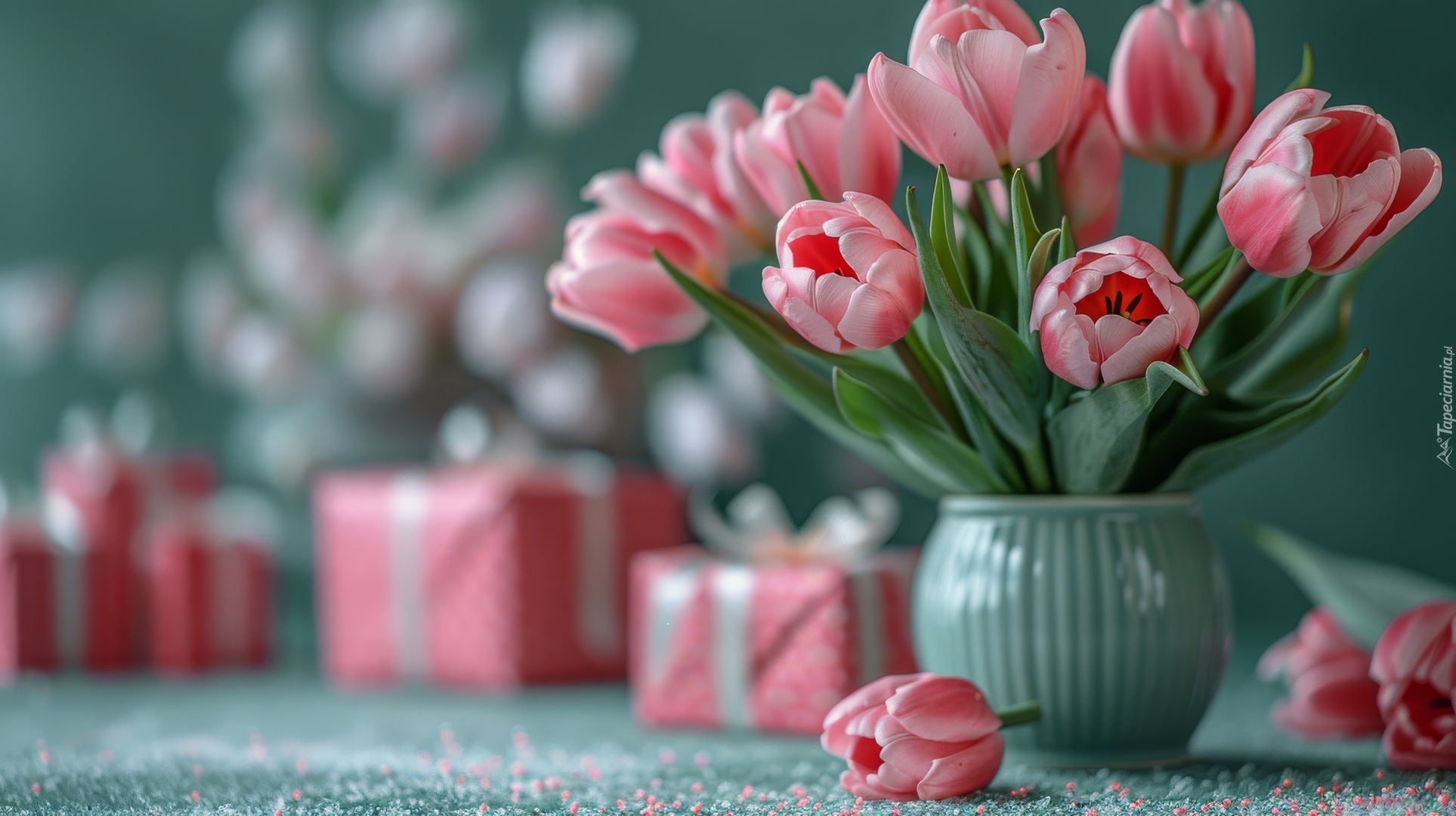 Edytor tapety: Bukiet tulipanów w wazonie z prezentami w tle