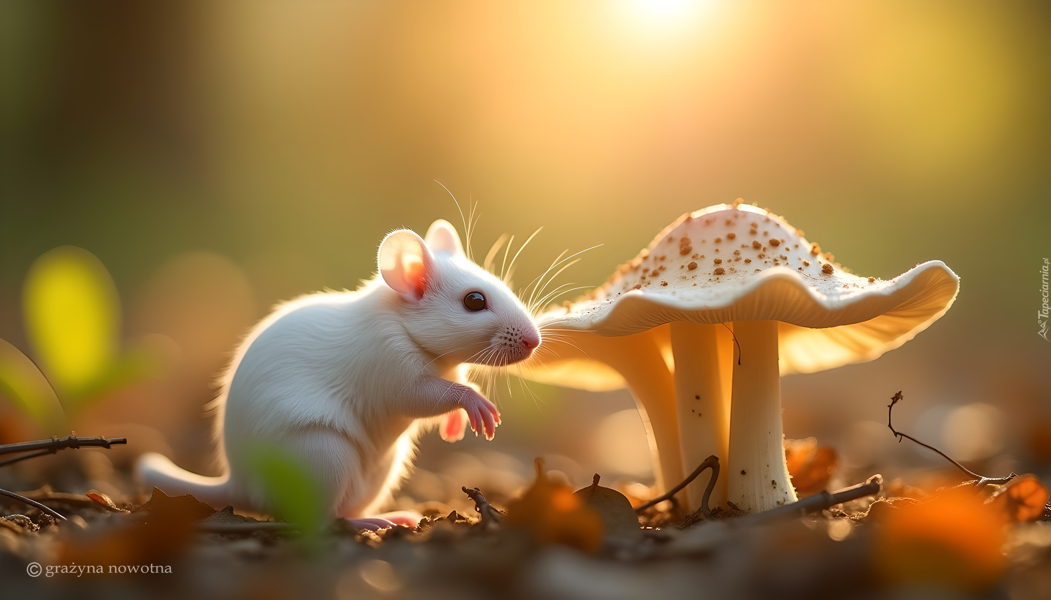 Edytor tapety: Biała myszka obok grzyba w grafice