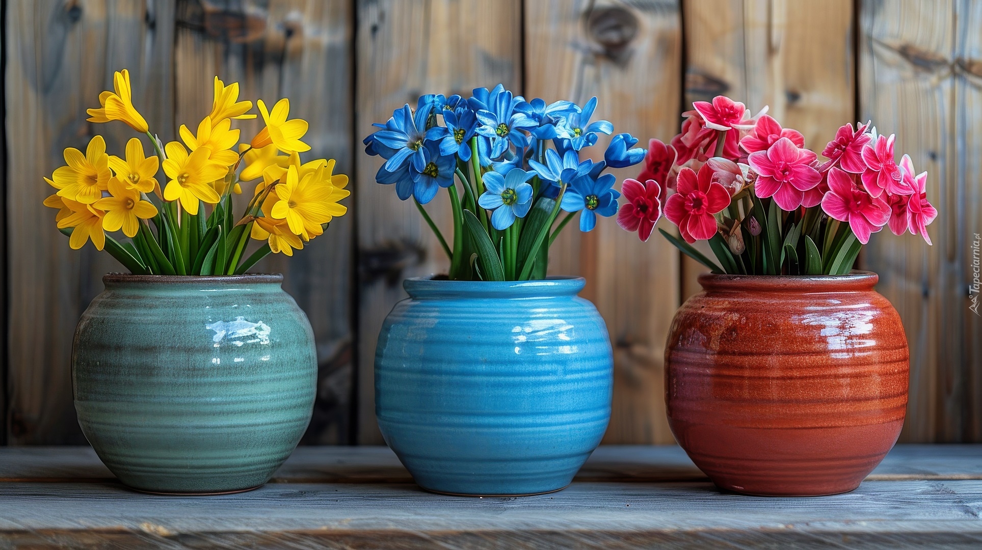 Edytor tapety: Kolorowe kwiaty w trzech kolorowych wazonach