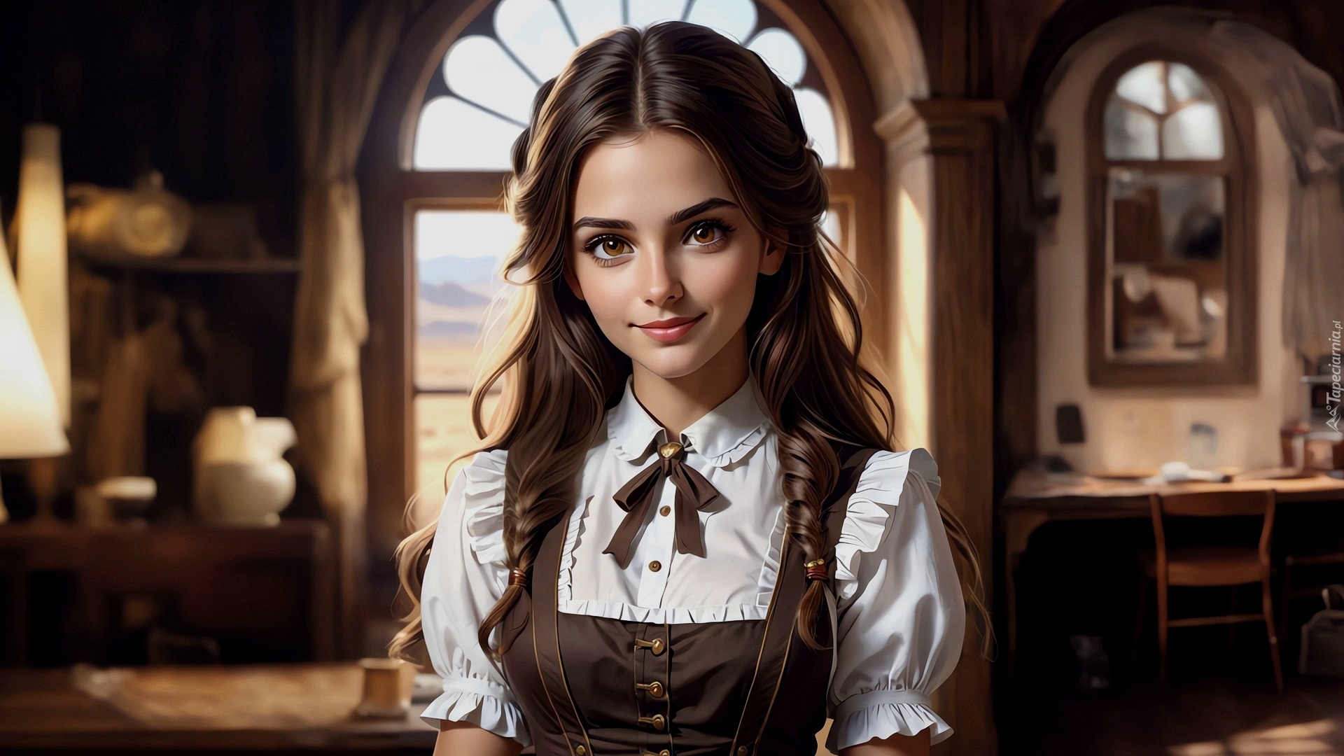 Edytor tapety: Długowłosa dziewczyna w białej bluzce na tle pokoju
