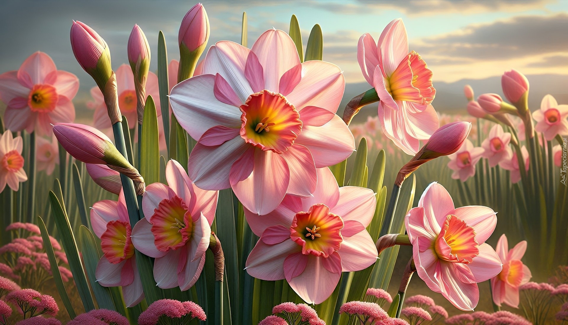 Edytor tapety: Różowe narcyzy z pąkami w grafice