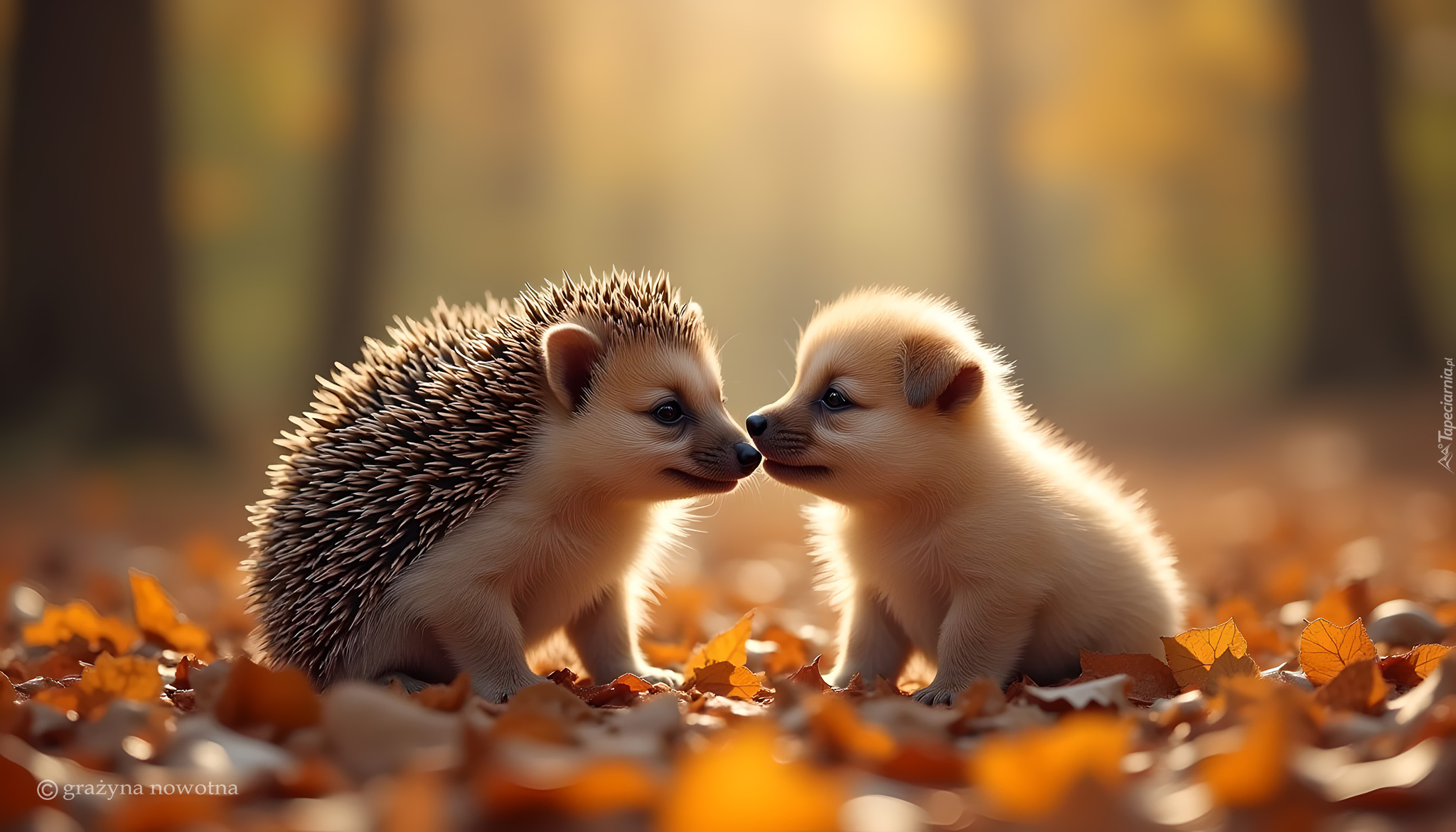 Edytor tapety: Mały jeż i szczeniak na jesiennych liściach