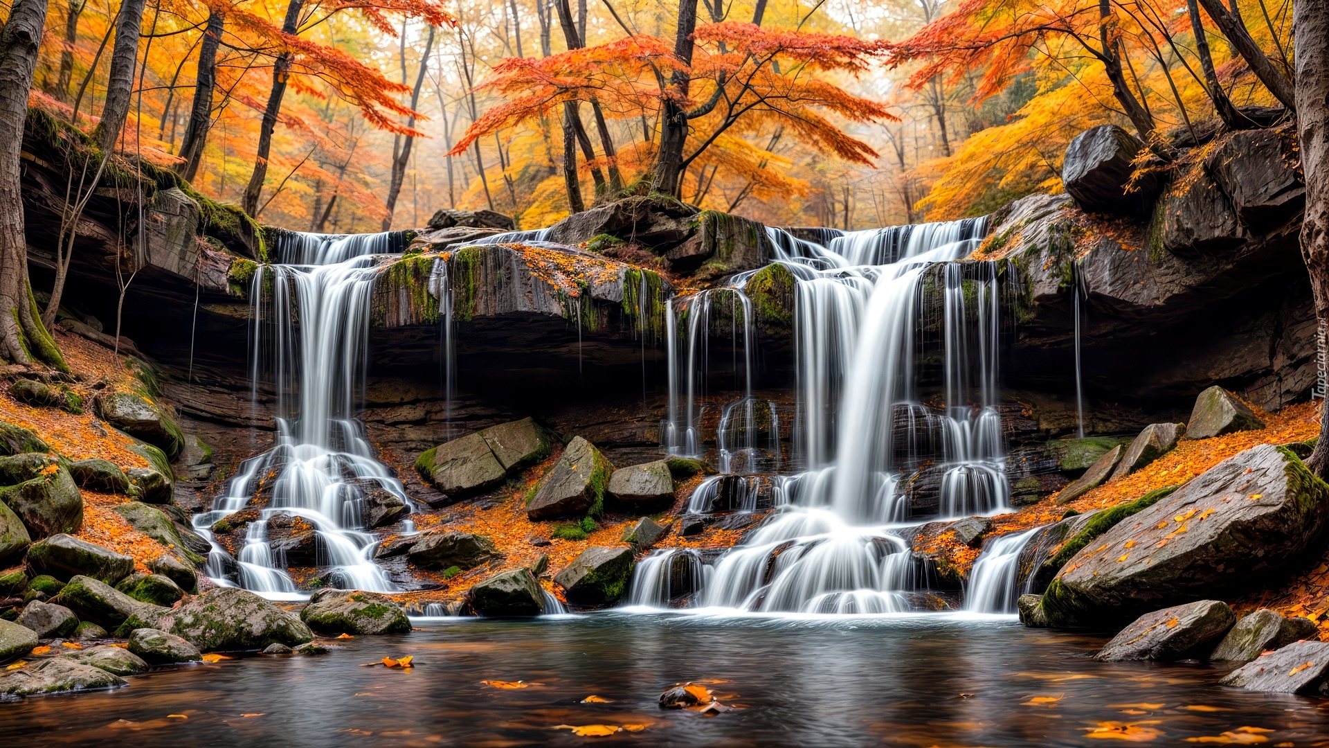 Edytor tapety: Jesienne drzewa przy wodospadzie na skałach