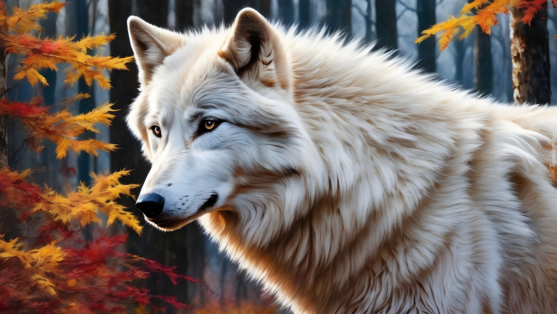 Edytor tapety: Biały wilk w jesiennym lesie
