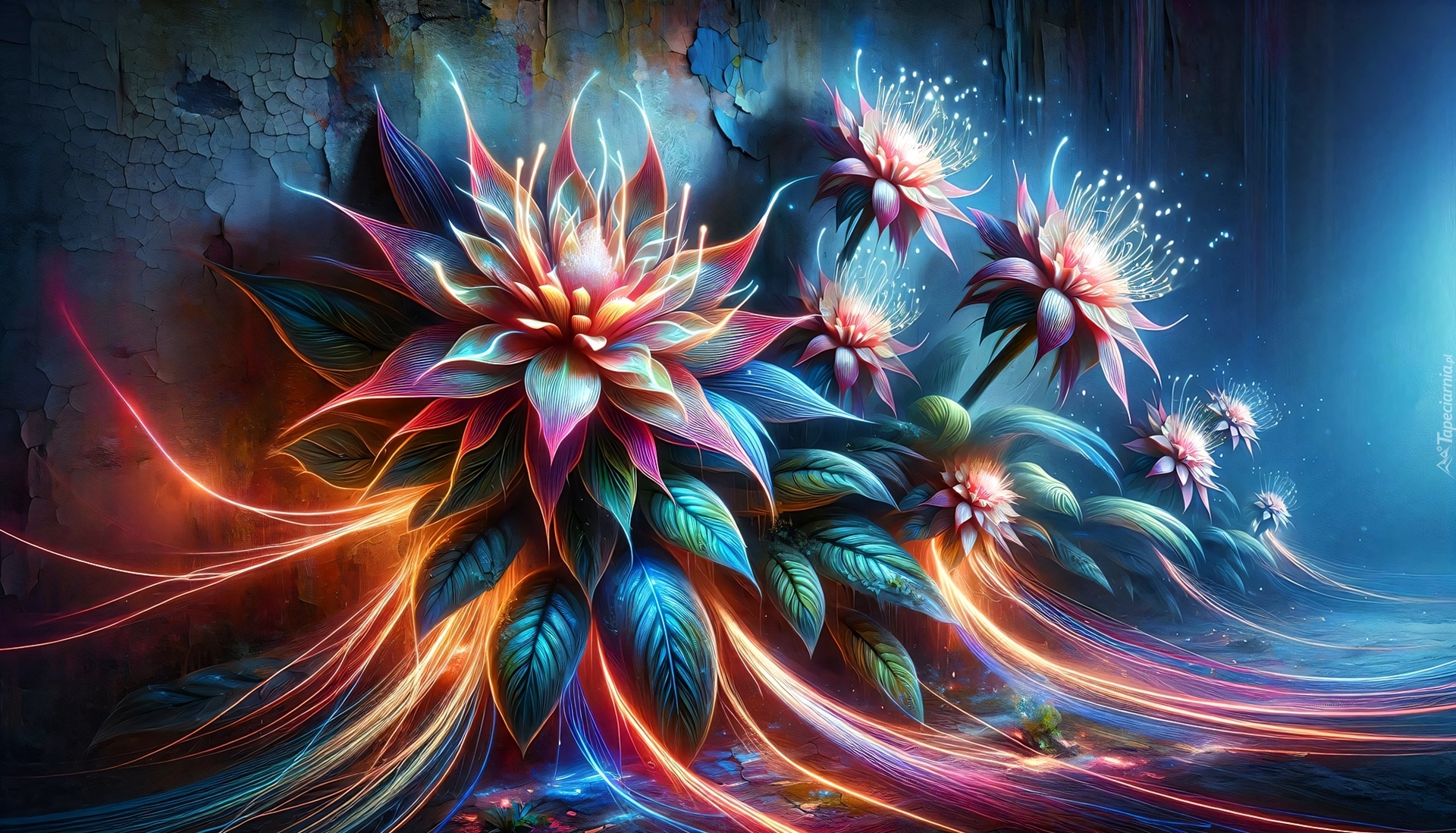 Edytor tapety: Rozświetlone kolorowe kwiaty przy ścianie w grafice