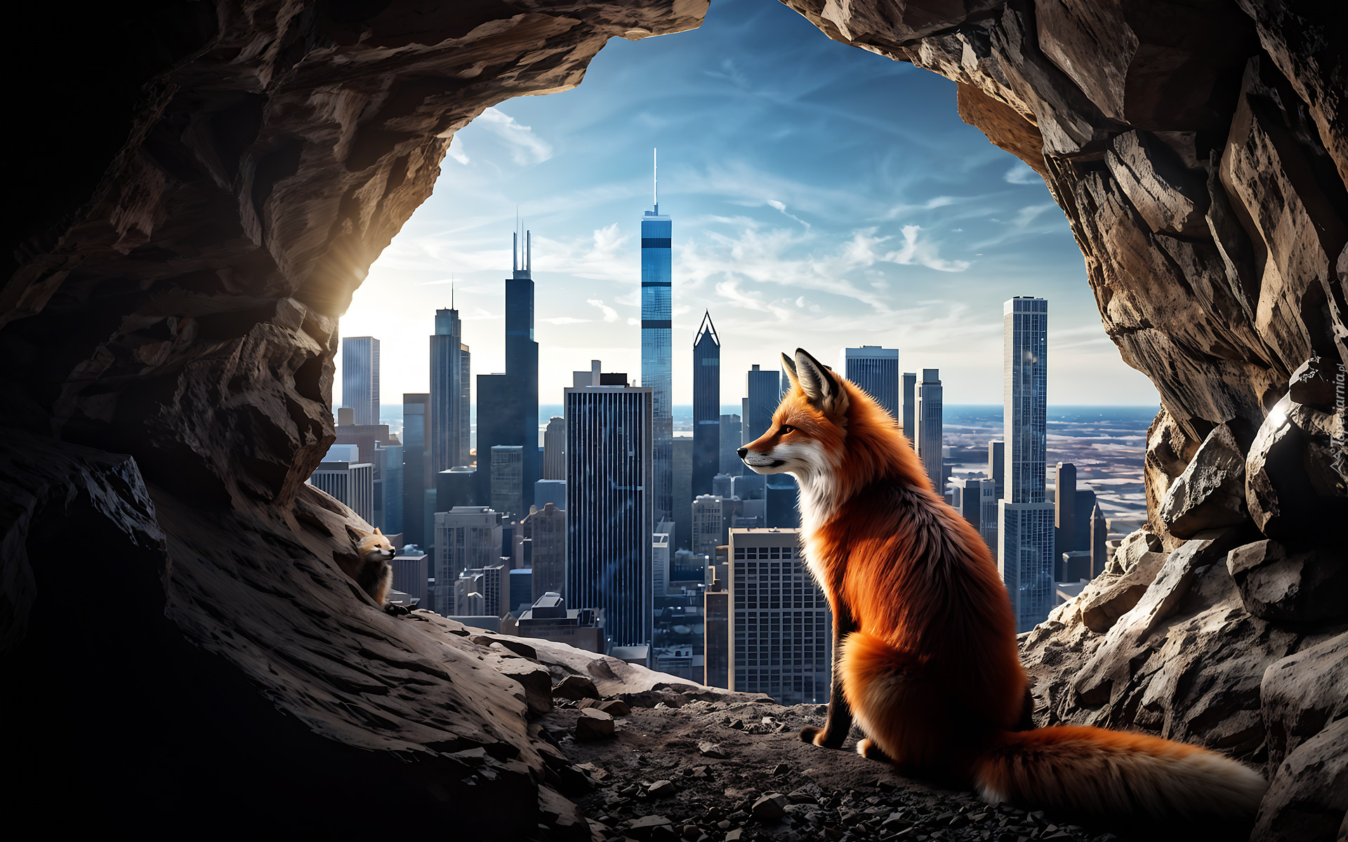 Edytor tapety: Siedzący lis w jaskini z widokiem na wieżowce