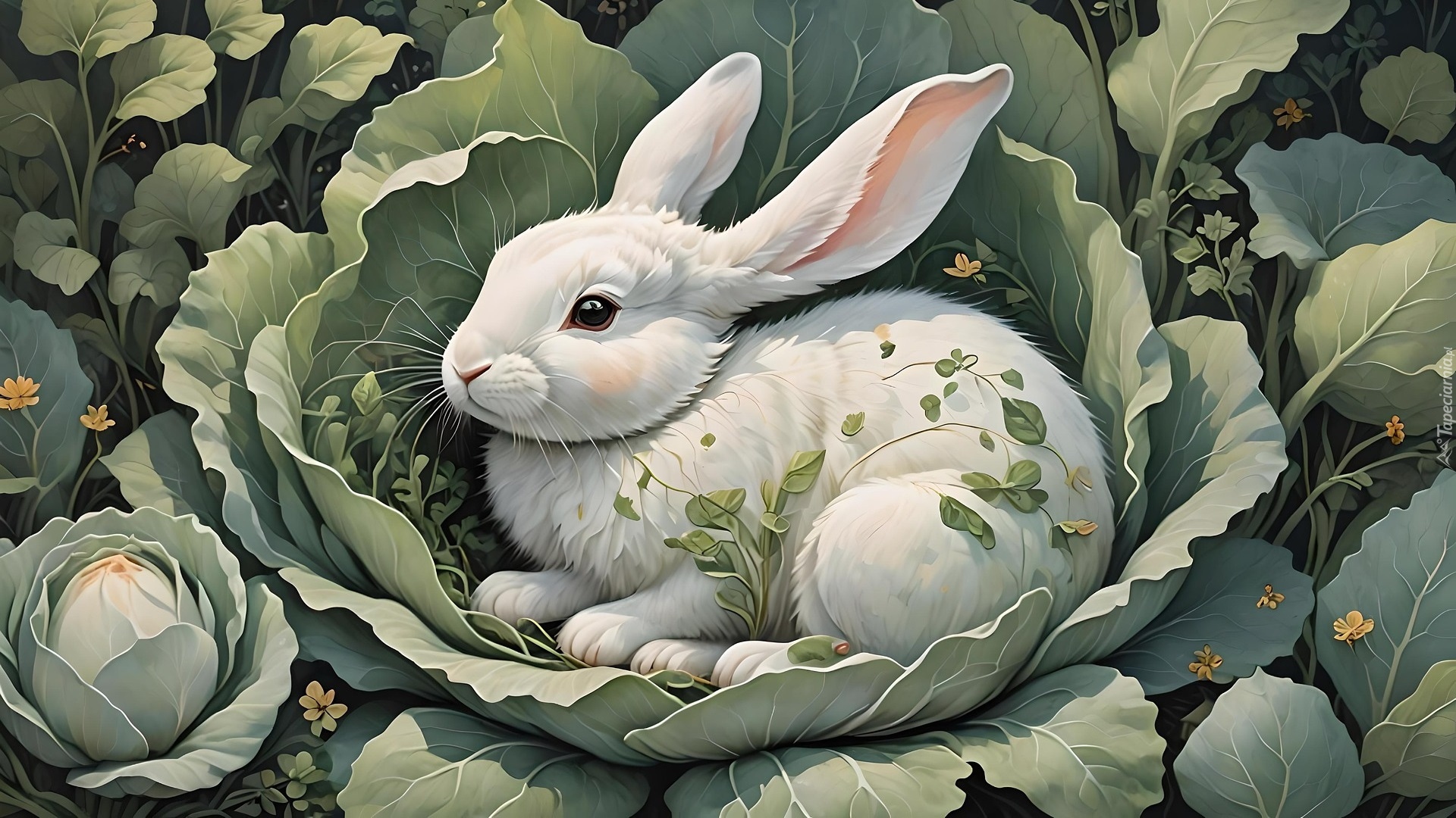 Edytor tapety: Grafika z białym królikiem w liściach kapusty