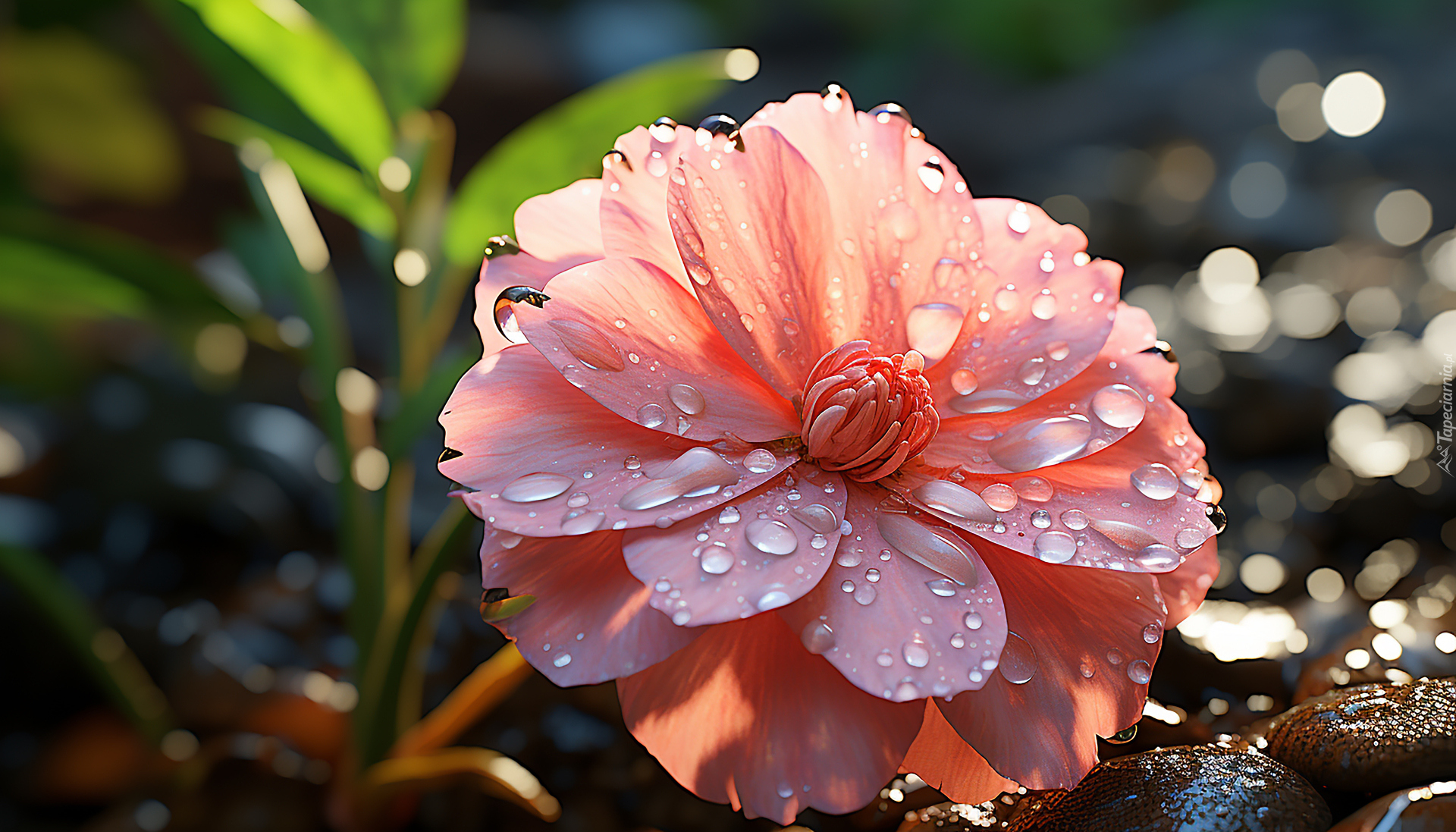 Edytor tapety: Krople wody na rozkwitniętym różowym kwiatku
