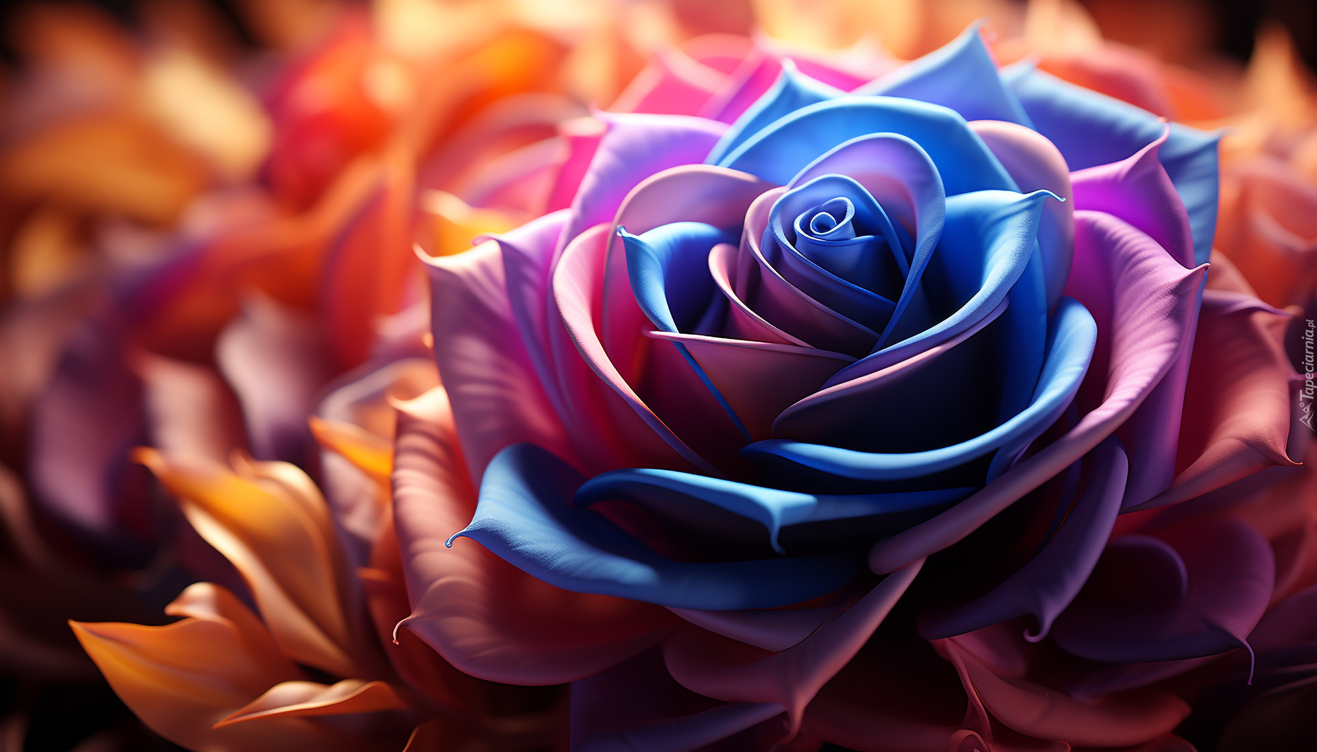 Edytor tapety: Rozkwitnięta niebiesko-różowa róża w zbliżeniu