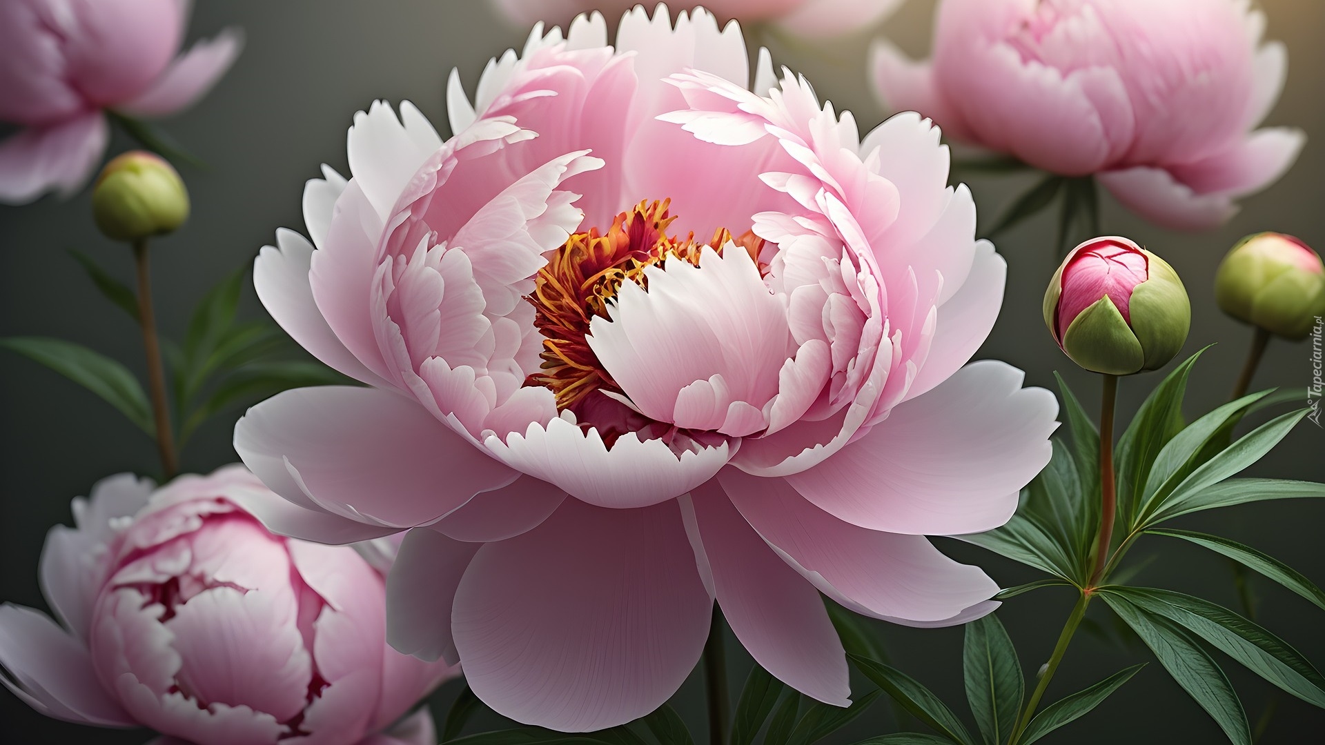 Edytor tapety: Różowe piwonie z pąkami w zbliżeniu w grafice