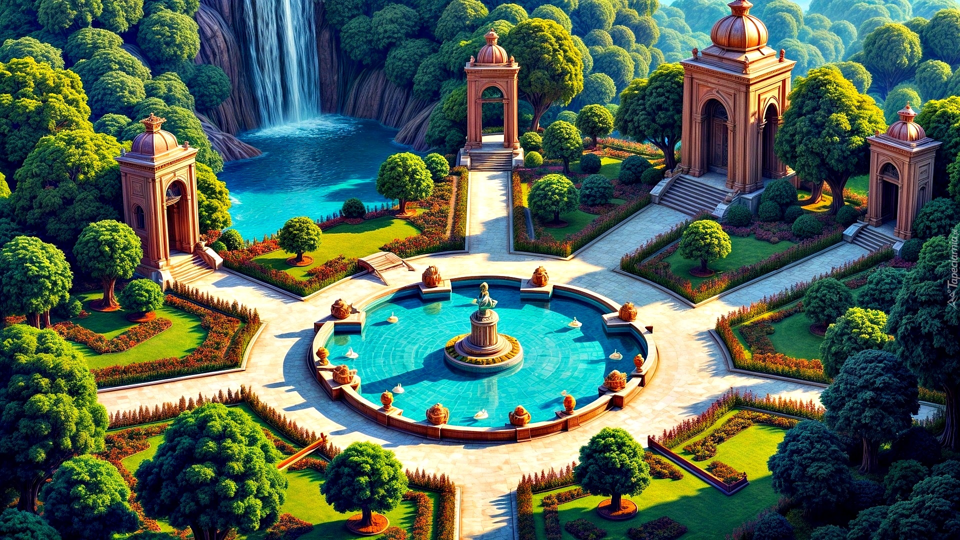 Edytor tapety: Ogród z wodospadem w tle w grafice