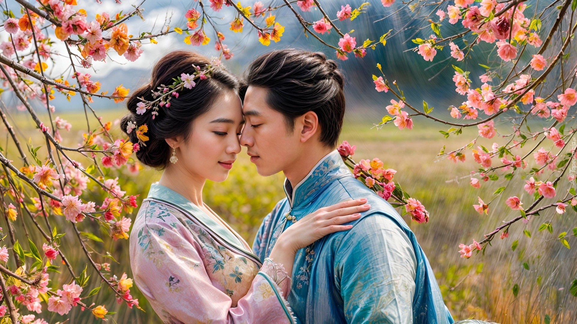 Edytor tapety: Para młodych Azjatów pod ukwieconymi gałązkami