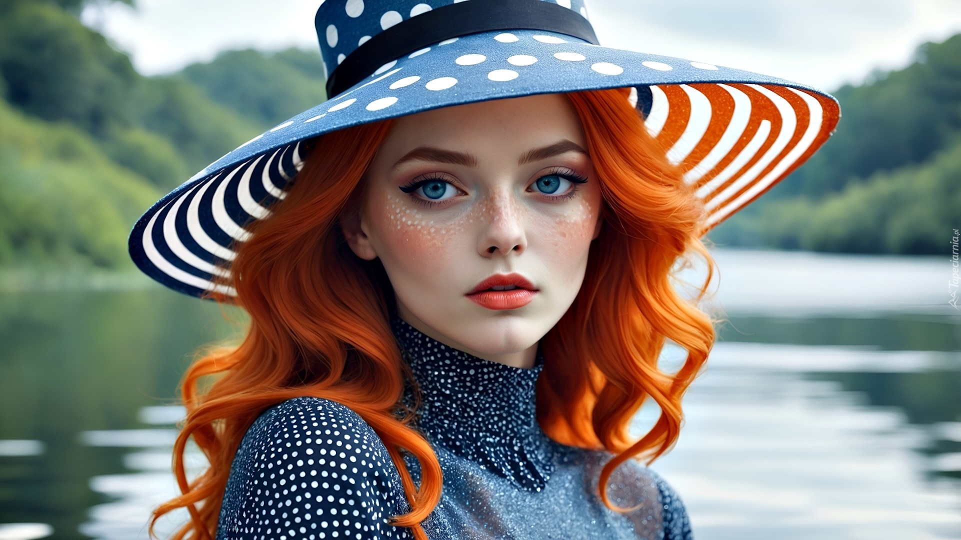 Edytor tapety: Piegowata rudowłosa kobieta w kapeluszu na tle rzeki
