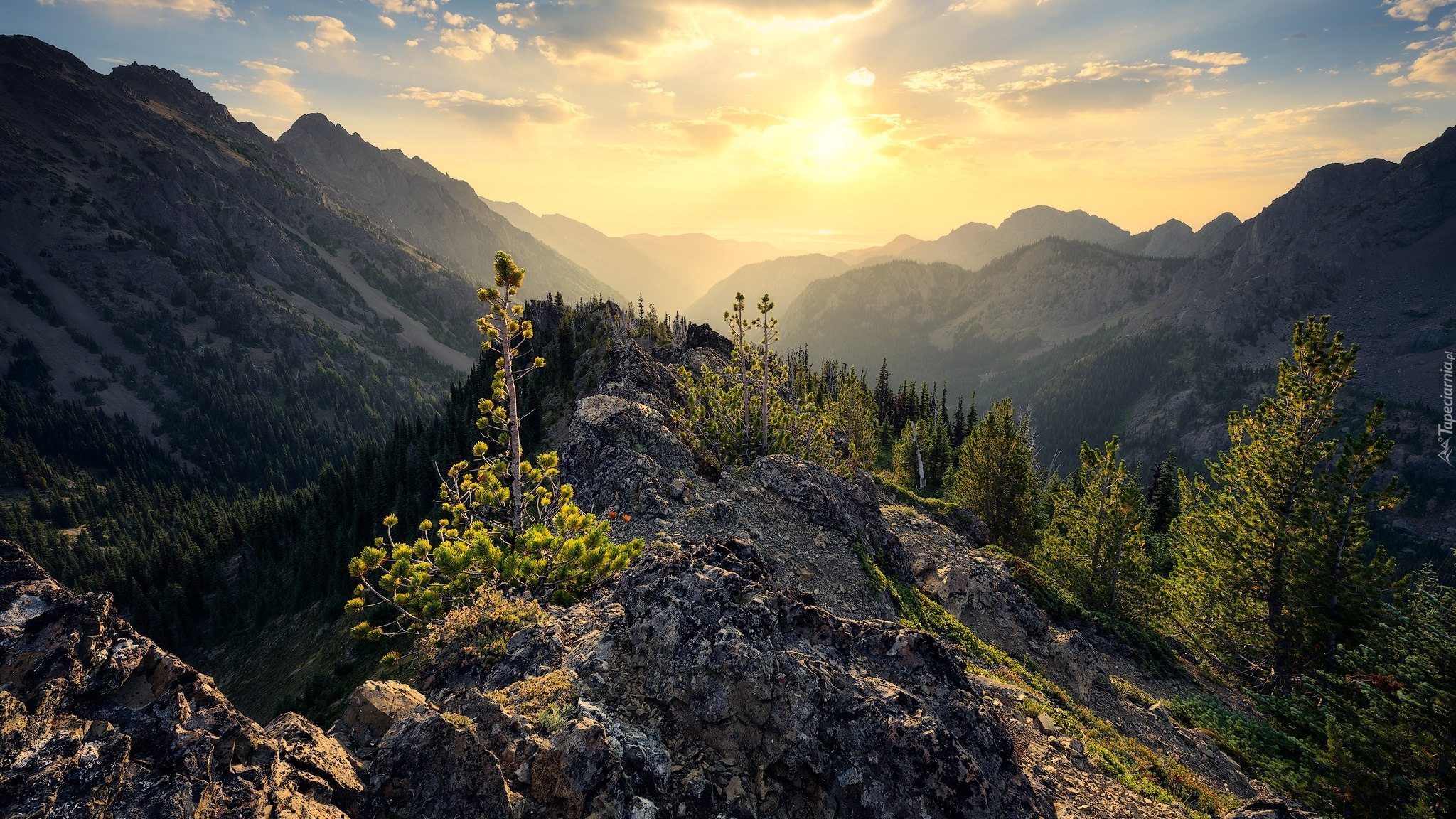 Edytor tapety: Rozświetlone drzewa na skałach i słońce nad górami