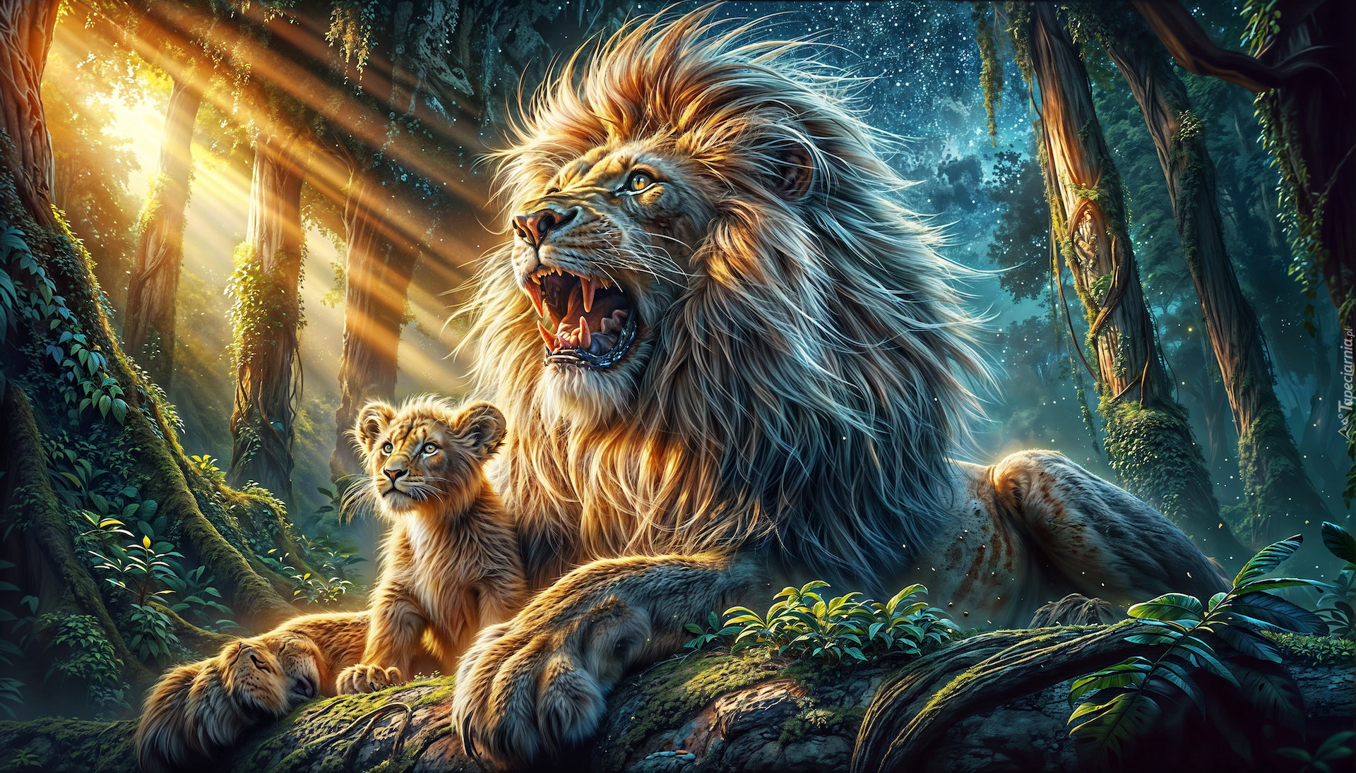 Edytor tapety: Lew z małym lwiątkiem na konarze w grafice