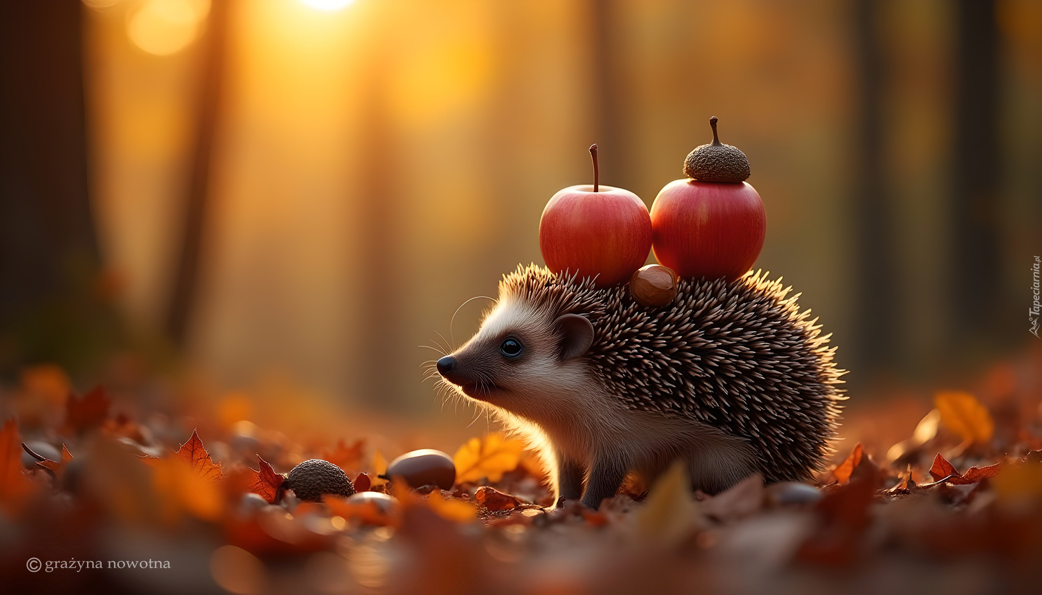 Edytor tapety: Jeż z dwoma jabłkami i kasztanem na grzbiecie