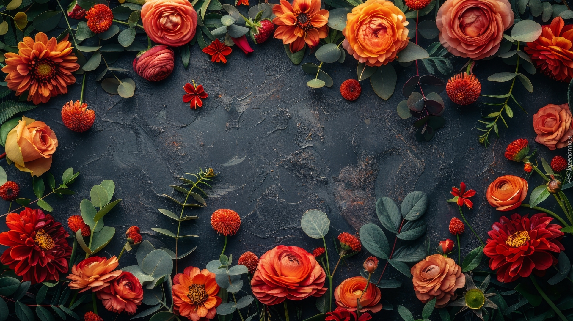 Edytor tapety: Pomarańczowe kwiaty z liśćmi na czarnym tle