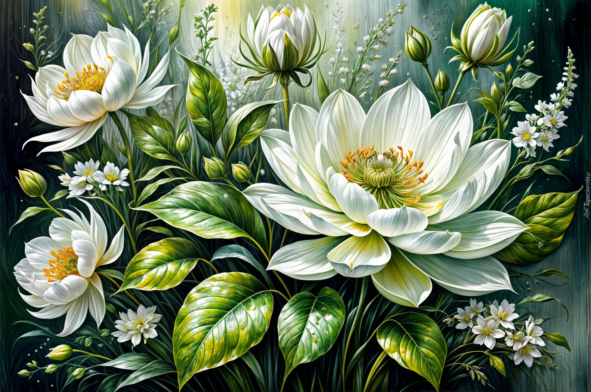 Edytor tapety: Grafika z białymi kwiatami i liśćmi
