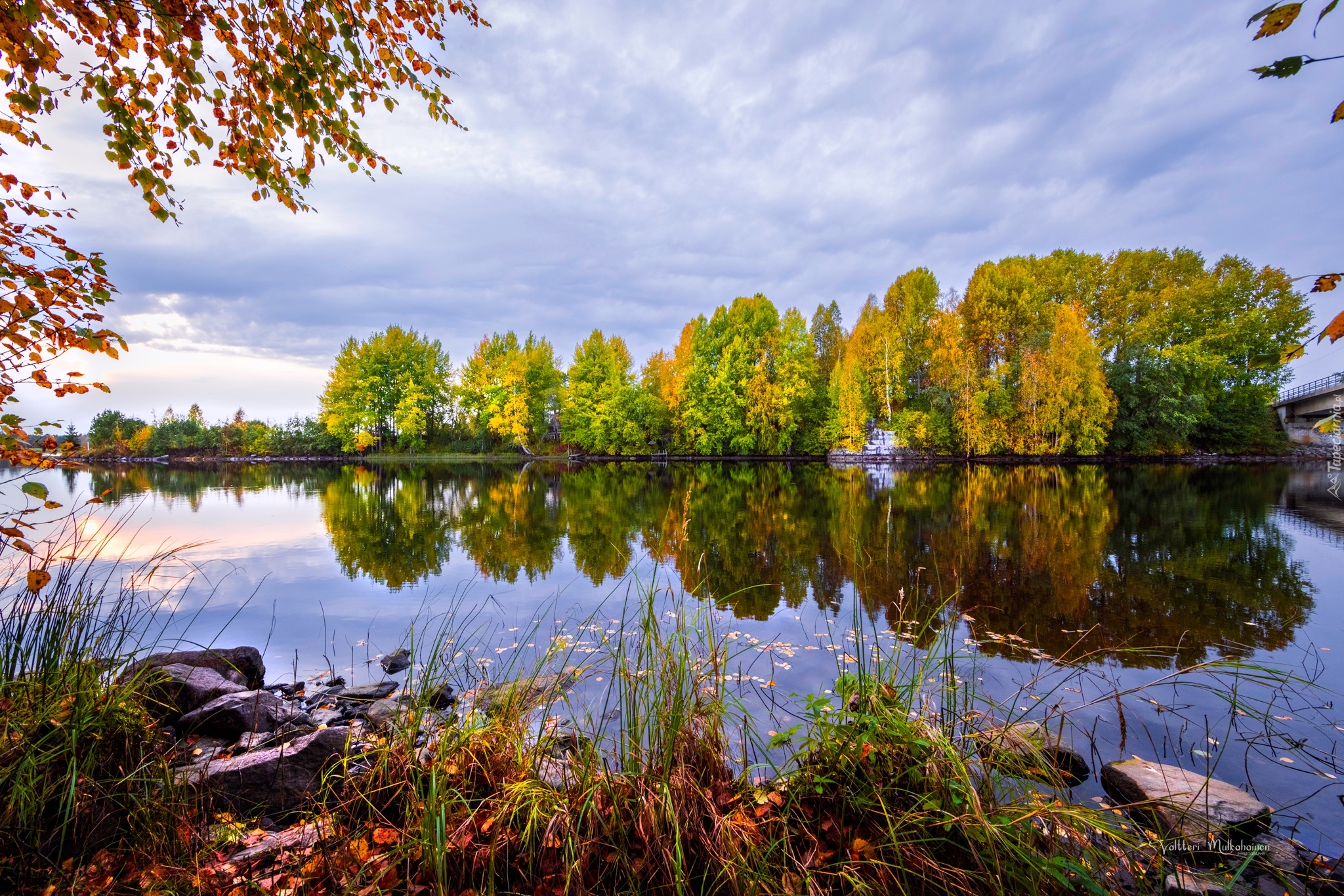 Edytor tapety: Zielone i pożółkłe drzewa nad rzeką