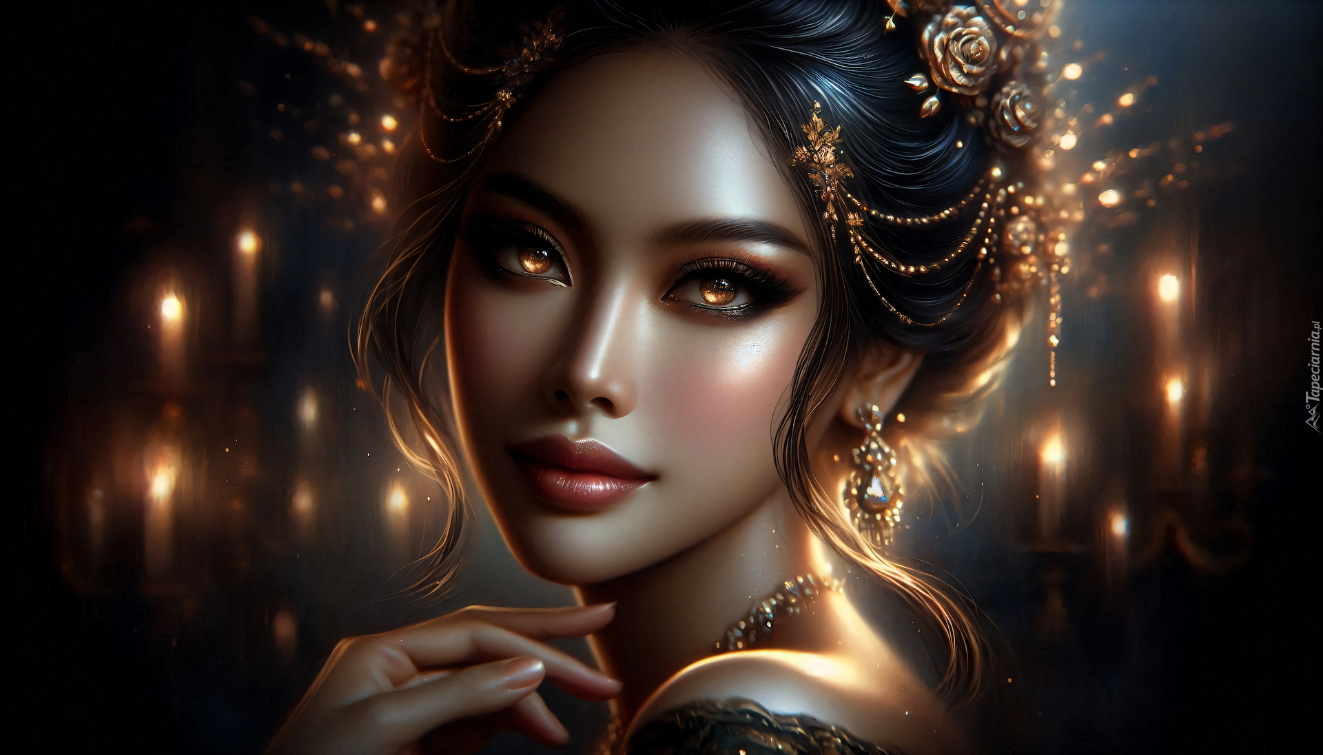 Edytor tapety: Twarz kobiety z biżuterią w upiętych włosach