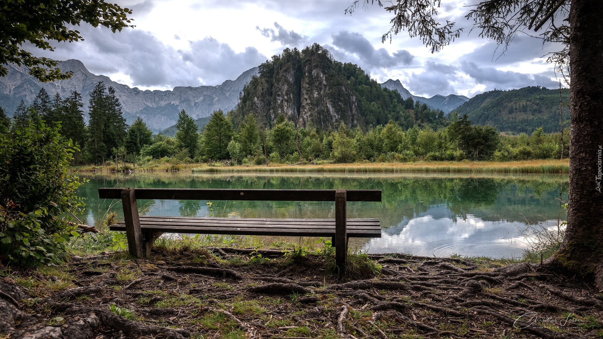 Edytor tapety: Ławka nad jeziorem Almsee z widokiem na góry
