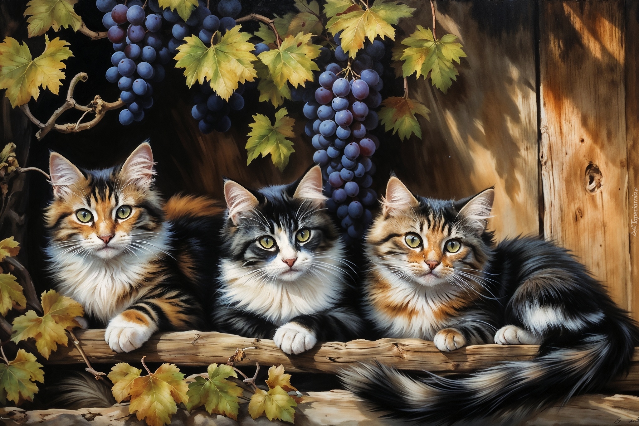 Edytor tapety: Trzy koty pod kiściami winogron w grafice