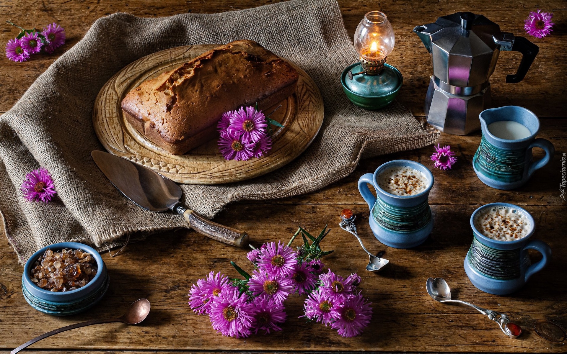 Edytor tapety: Kubki obok kawiarki i ciasta na materiale