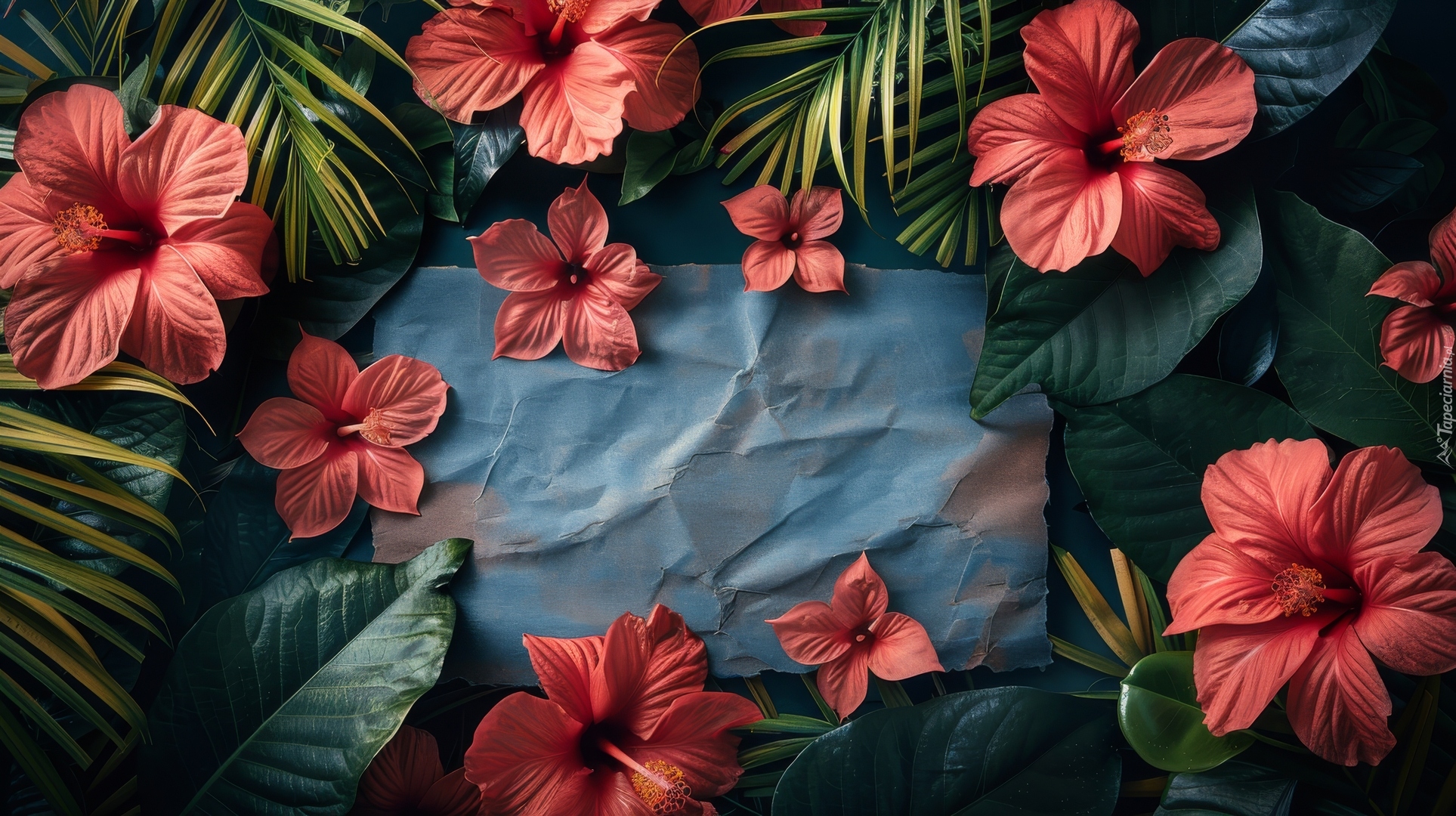 Edytor tapety: Kartka wśród hibiskusów i liści