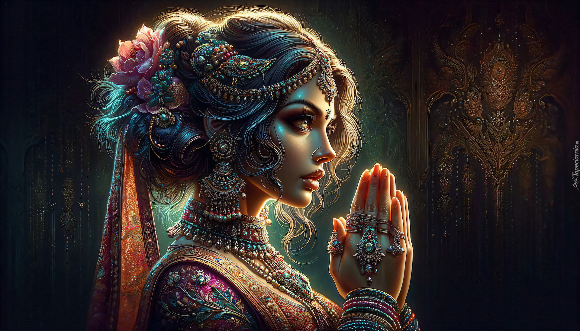 Edytor tapety: Modląca się kobieta z biżuterią i upiętymi włosami