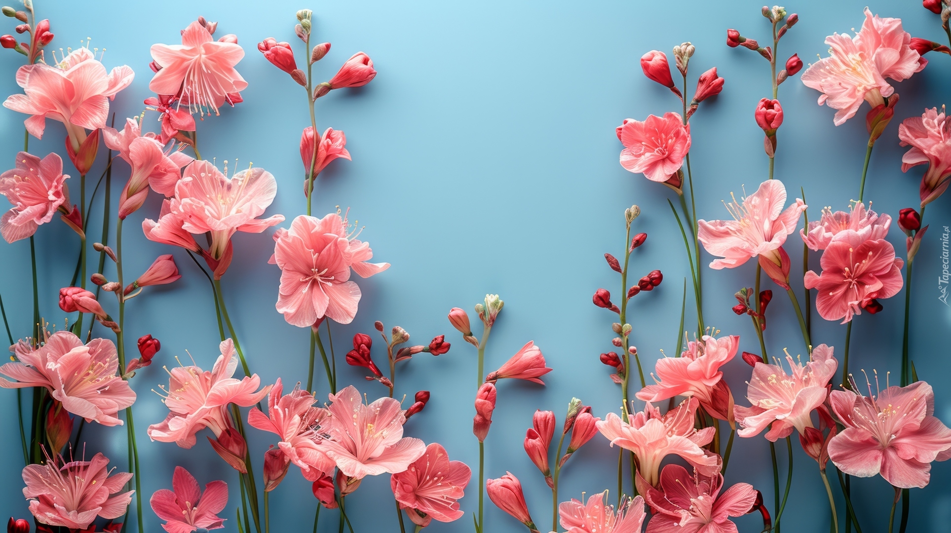 Edytor tapety: Różowe kwiaty z pąkami na niebieskim tle
