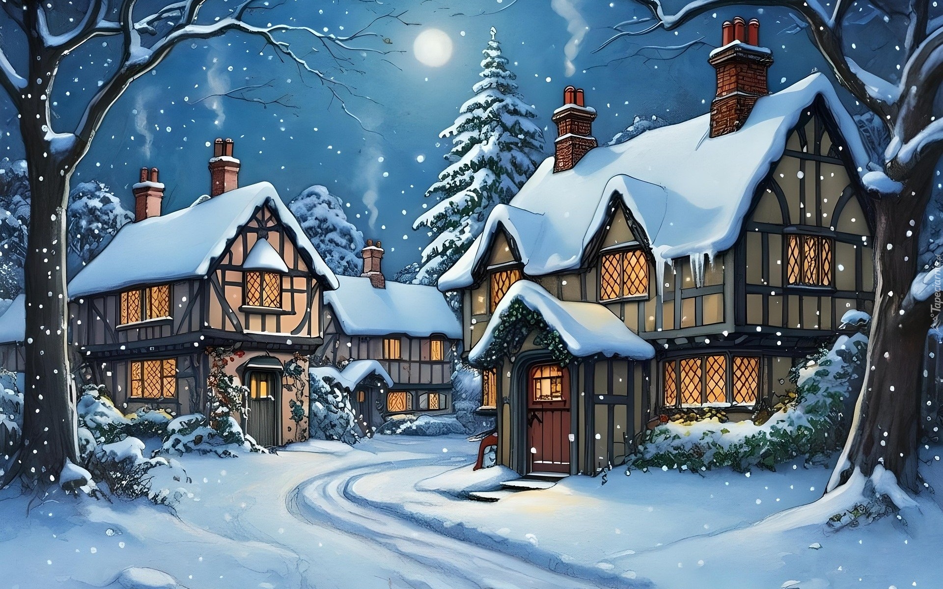 Edytor tapety: Oświetlone domy wśród drzew w zimowej scenerii