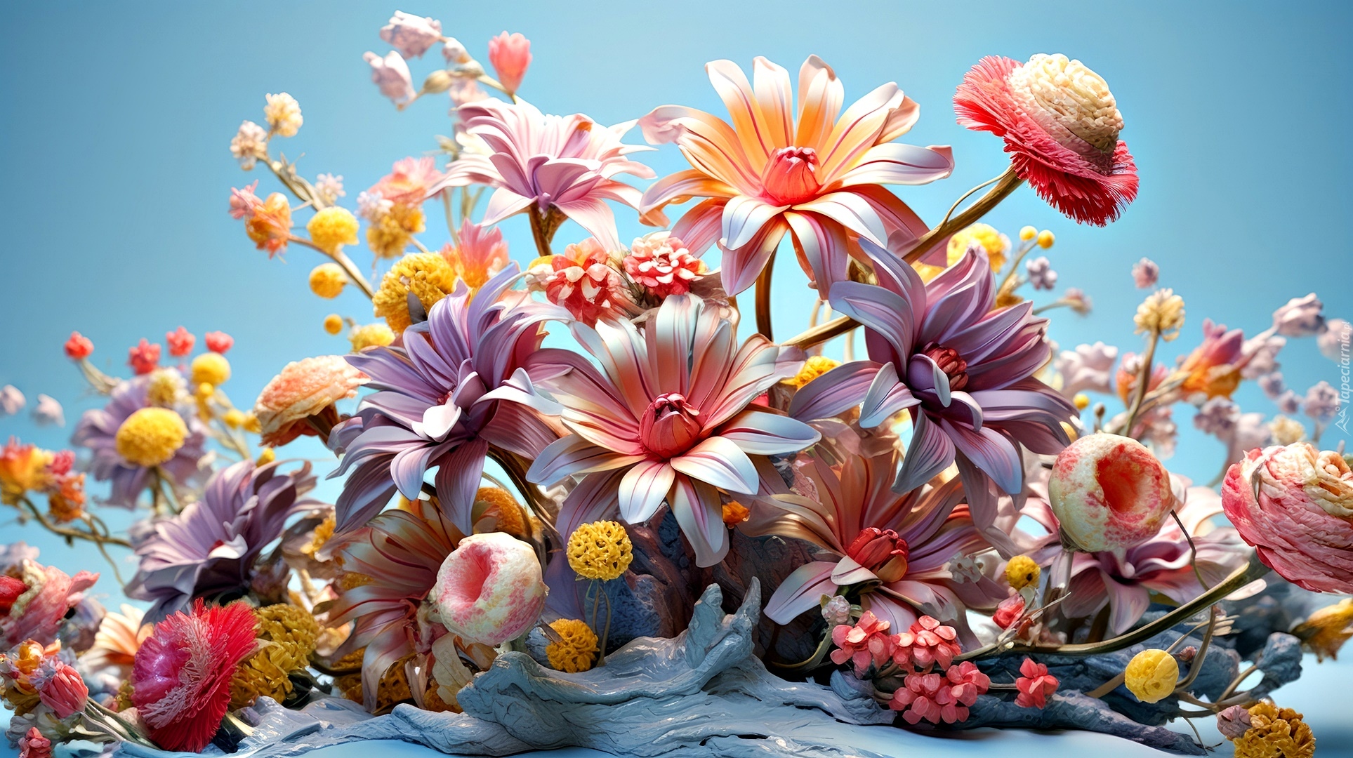 Edytor tapety: Kolorowe kwiaty na niebieskim tle w grafice